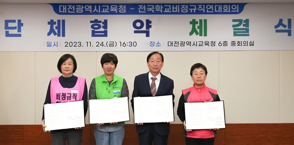 [충청뉴스 이성현 기자] 대전시교육청이 전국학교비정규직연대회의(학비연대)와 2023년 단체협약 체결식을 개최했다.