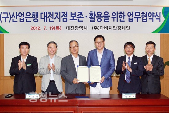 19일 오전 시청 창의실에서 박상덕 시 행정부시장을 비롯해 김인규 (주)다비치안경체인 대표, 관계자 등이 참석한 가운데 (구)산업은행 대전지점의 보존과 활용 위한 업무협약을 체결했다.