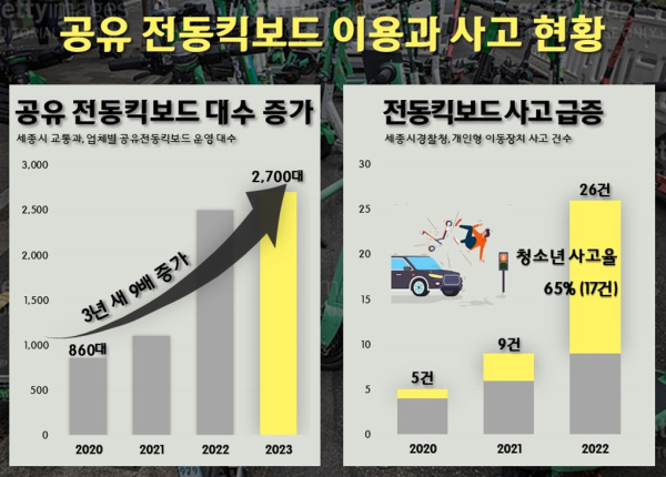 김 의원에 따르면 간편하게 이용할 수 있고 빠른 이동이 가능해 최근 3년간 지역 내 공유 전동킥보드 운영 대수는 9배나 늘어 2,700여 대가 되었다. 하지만 관련 사고도 크게 늘어 최근에 보행자 사망사고와 더불어 두 명이 동시 탑승한 학생들이 승용차와 충돌하는 사고도 발생했다.