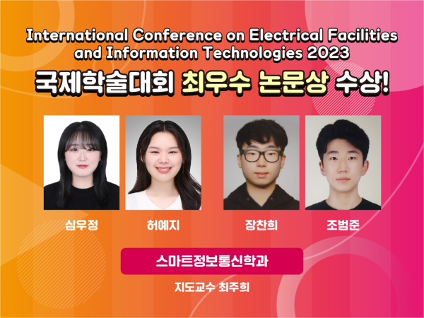 [충청뉴스 박동혁 기자] 상명대학교는 공과대학 스마트정보통신공학과 4학년 조범준, 장찬희, 심우정, 허예지 학생들의 연구논문이 ’ICEF 2023‘에서 최우수 논문상을 받았다고 30일 밝혔다.