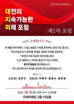 [충청뉴스 성희제 기자] ‘대전의 지속가능한 미래(이하 대지미)’포럼은 오는 5일 오페라웨딩 2층 타임홀에서 ‘노후계획도시, 이대로 좋은가?’라는 주제로 제1차 포럼을 개최한다.