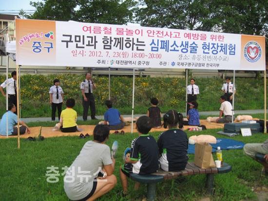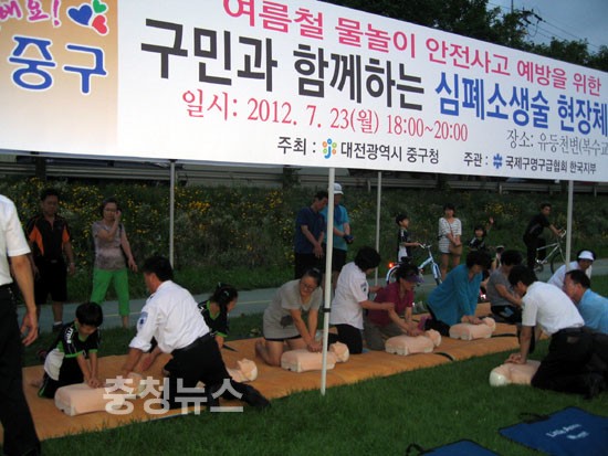 대전광역시 중구(구청장 박용갑)는 여름철 물놀이 안전사고 예방 및 응급상황에 신속하게 대처하기 위해 '구민과 함께하는 심폐소생술 현장체험' 행사를 23일 유등천 복수교 주변 잔디광장에서 개최했다.
