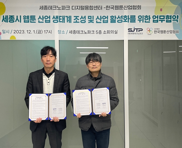 [충청뉴스 최형순 기자] (재)세종테크노파크(원장 양현봉)는 (사)한국웹툰산업협회(협회장 서범강)과 "세종 지역 웹툰 산업 생태계 조성과 산업 활성화를 위하여 지난 1일 업무협약을 체결했다"고 4일 밝혔다.