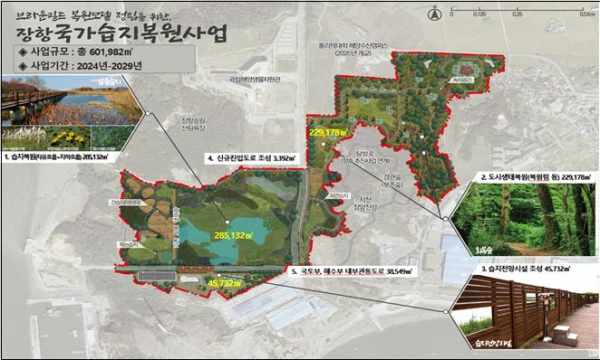 사업이 완료되면 옛 장항제련소 주변에 28만 5000㎡ 규모의 습지, 생태숲을 포함한 22만 9000㎡ 규모의 녹지, 습지전망시설과 탐방로 등이 조성된다.