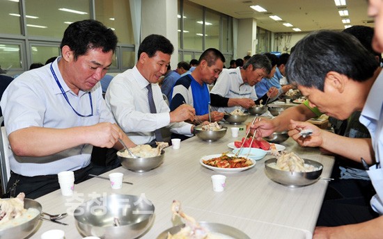 ▲ 환경관리요원 111명을 격려하기 위해 오찬으로 삼계탕을 제공했다.