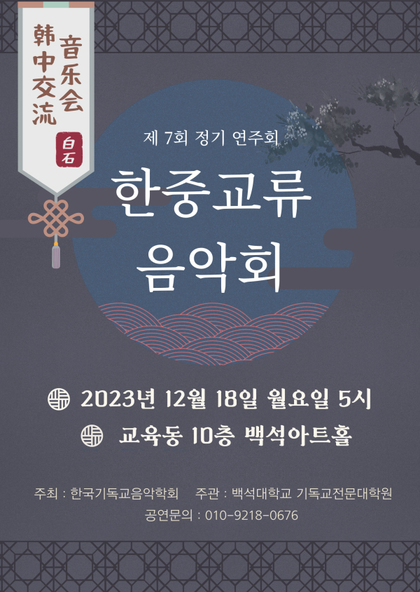 [충청뉴스 박동혁 기자] 백석대학교는 기독교전문대학원 음악학전공 박사과정이 오는 18일 오후 5시 백석대 서울캠퍼스에서 ‘2023 한중교류음악회’를 개최한다고 밝혔다.