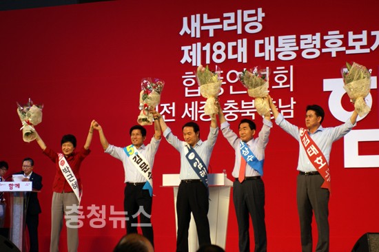 2일 오전 천안 유관순체육관에서 열린 새누리당 대선 경선 합동연설회에 참석한 후보 전원은 대선 승리의 ‘열쇠’를 충청권이라고 강조하며, 지지를 호소했다.