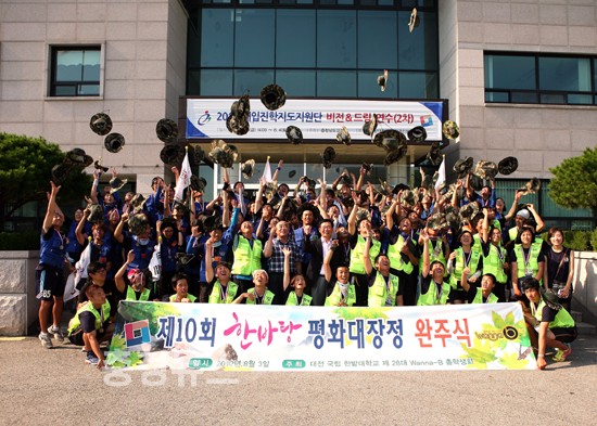 한밭대학교(총장 이원묵) 제28대 총학생회(회장 최태은/건축공학과 3학년)가 '희망의 발, 그 자취를 남겨라'라는 주제로 지난 7월 23일부터 8월 3일까지 11박 12일동안 국토순례를 무사히 완주하고 대학본부 앞에서 해단식을 가졌다.