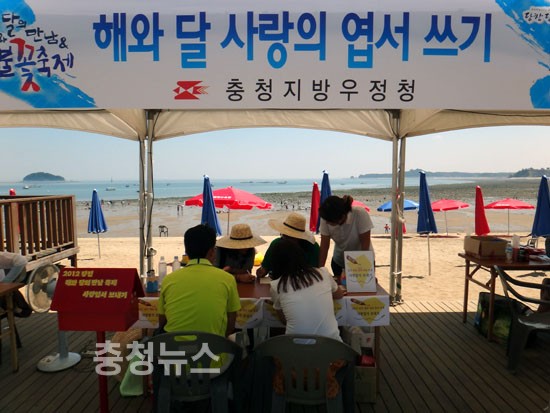 충청지방우정청(청장 장석구)은 ’2012 당진 해와 달의 만남 & 바다불꽃 축제’ 에서 고객 맞춤형 우편엽서를 활용한 '사랑엽서 보내기' 체험행사를 5일 진행했다고 밝혔다.