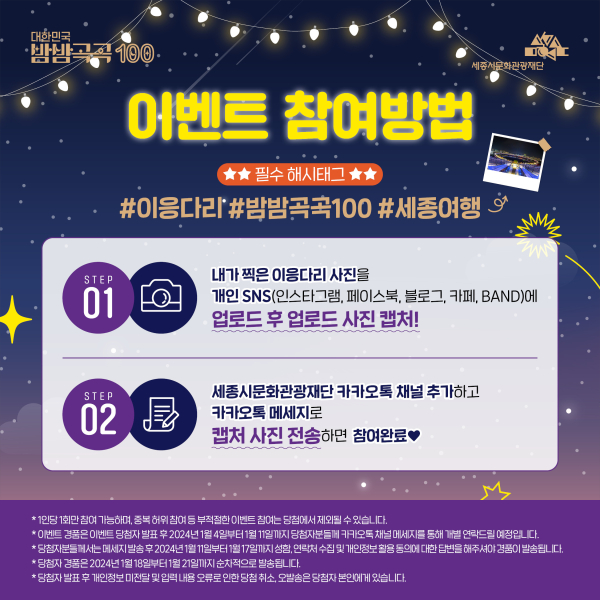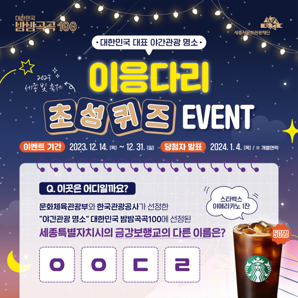 이 외에 온라인 이벤트도 동시에 진행한다. 개인 누리소통망(SNS)에 ‘이응다리 방문 인증샷’을 핵심어 표시(해시태그, #)와 함께 공유하거나, 재단 누리소통망(SNS)에 게재된 이응다리 초성퀴즈 게시물에 댓글로 참여하면 추첨을 통해 식음료 등 다양한 경품을 제공한다. 자세한 내용은 세종시문화관광재단 누리집(sjcf.or.kr)에서 확인 가능하다.