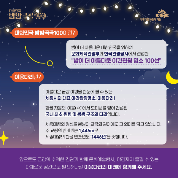 세종시를 대표하는 야간관광 명소인 이응다리는 금강의 수려한 야경과 함께 다양한 문화예술 행사를 즐길 수 있는 공간으로, 올해 11월 문화체육관광부와 한국관광공사의 야간관광 명소 ‘대한민국 밤밤곡곡 100’에 선정되었다.