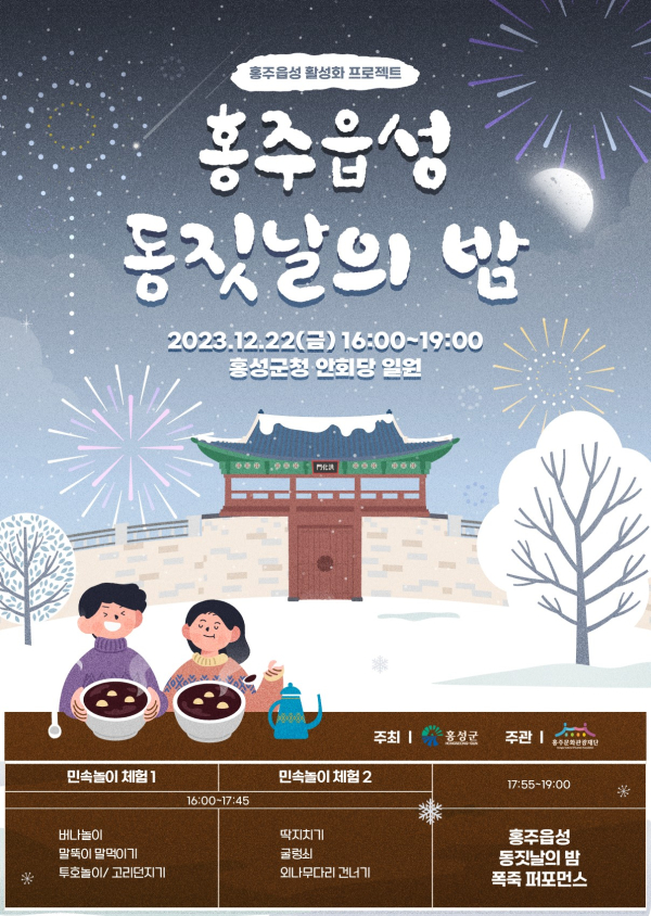 이번 행사는 ▲민속놀이 체험(버나놀이, 말뚝이 말먹이기, 투호놀이, 고리던지기, 딱지치기, 굴렁쇠, 외나무다리 건너기 등) ▲전통한복 체험 ▲동지팥죽 시식 체험 ▲야간경관 포토존으로 구성되어 진행된다.