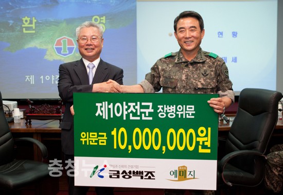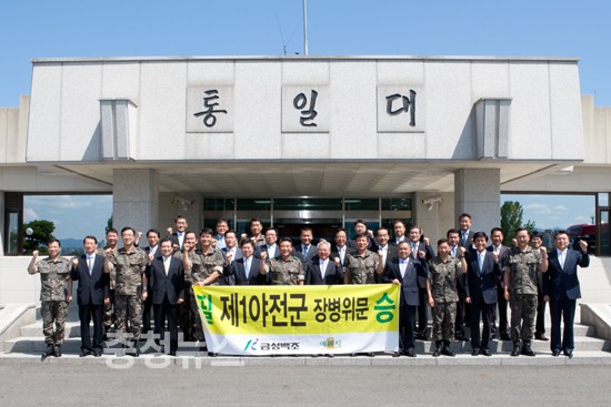 (주)금성백조주택 정성욱 회장과 임직원 20여명, 육군3사관학교 총 동문회원 10여명은 7일 오전 11시, 최전방부대인 육군 제1야전군사령부(사령관 대장 박성규)를 방문하여 안보교육에 참가한 후 장병들의 사기진작에 써달라며 위문금 1천만원을 전달했다.