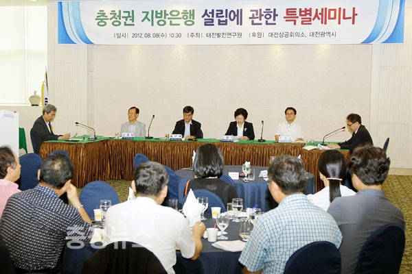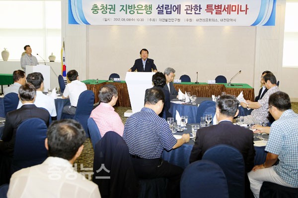 충청권 지방은행 설립에 관한 특별 세미나가 8일 오전 오페라웨딩홀에서 염홍철대전시장을 비롯해 이창기 대전발전연구원장, 류덕위 한밭대교수, 시민, 관련 전문가 등이 참석한 가운데 열렸다.