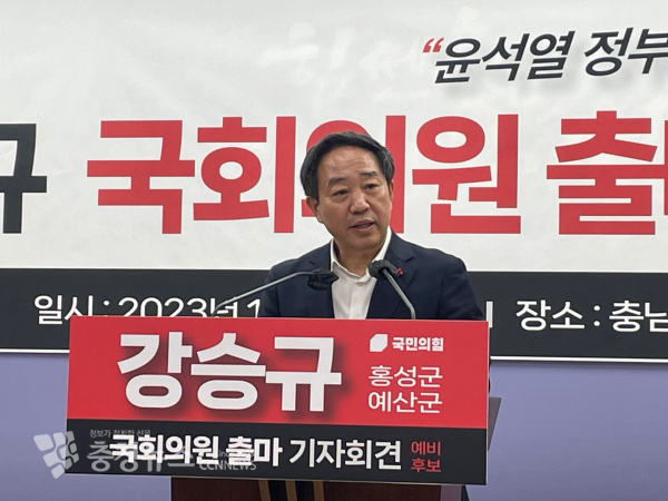 [충청뉴스 권상재 기자] 강승규 전 대통령실 초대 시민사회수석은 26일 제22대 국회의원 선거 홍성·예산군 예비후보로 등록하고 출마를 선언했다.