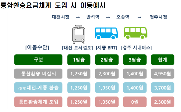 통합 환승할인제는 기존 대전과 세종에만 적용하던 것을 청주, 공주시까지 확대하여 BRT광역버스나 도시철도, 시내버스를 이용할 경우 최초 탑승 시 기본요금을 내면 환승 시 추가요금 부담 없이 이용하는 제도다.