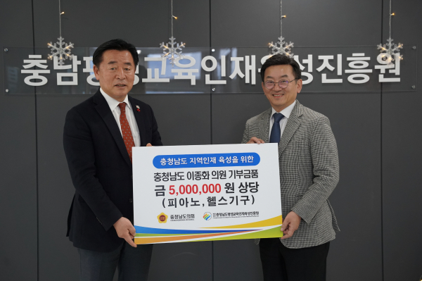 [충청뉴스 권상재 기자] 이종화 충남도의원은 지난 28일, 장학·교육사업 추진을 통한 충남 미래발전의 성장동력이 될 지역인재 발굴·육성을 위해 (재)충청남도평생교육인재육성진흥원(이사장 김태흠, 원장 박하식, 이하 진흥원)에 500만 원 상당 기부금품을 전달했다.