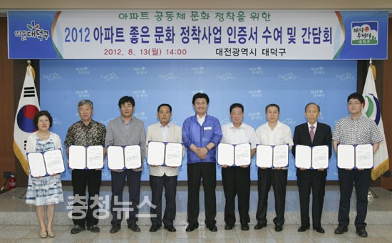 구는 13일 구청 중회의실에서 '2012 대덕구 아파트 좋은 문화 정착 공모사업' 인증서 수여식 및 간담회를 개최했다.