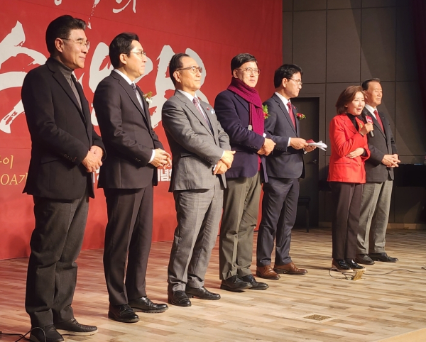 주요 인사들이 단상에 올라 축사를 전했다. (왼쪽부터)이응우 계룡시장, 박경귀 아산시장, 박상돈 천안시장, 이명수 국회의원, 이창수 위원장, 나경원 전 원내대표, 홍문표 국회의원/사진=박동혁 기자