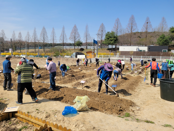 텃밭 두둑을 만들고 있는 천안도시농부학교 교육생들/천안시 제공