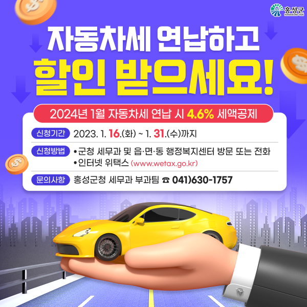 [충청뉴스 권상재 기자] 홍성군이 1월 자동차세 연납 신고납부의 달을 맞아 ‘자동차세 연납 할인제도’에 대한 적극 홍보에 나섰다.