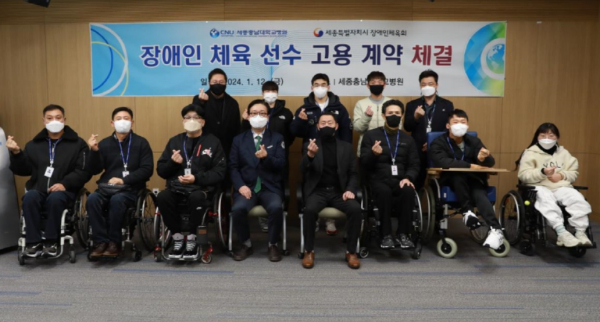 세종시장애인체육회는 지난 12일 세종충남대학교병원에서 임규모 사무처장과 이준영 세종충남대학교병원 사무국장 및 장애인체육 선수 등이 참석한 가운데 ‘장애인 선수 고용계약 체결식’을 개최했다.