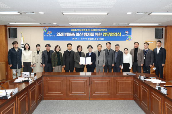 [충청뉴스 권상재 기자] 충남도 농업기술원은 17일 기술원 본관에서 농림축산검역본부(이하 검역본부)와 외래 병해충 확산 방지를 위한 업무협약을 체결했다.