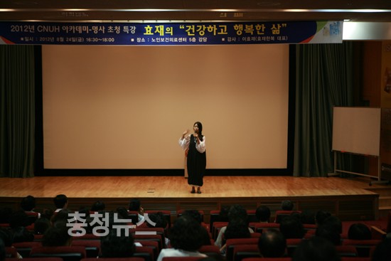 충남대학교병원(원장 송시헌)는 24일 오후 4시30분 부터 노인보건의료센터 5층 강당에서 자연주의 놀이꾼 보자기 아티스트 이효재씨를 초청 '건강하고 행복한 삶' 이란 주제로 강연을 가졌다.
