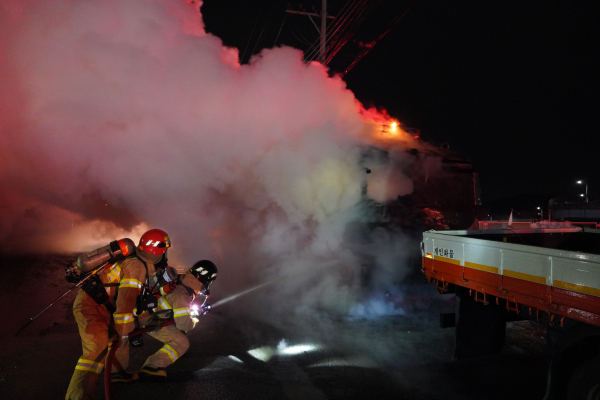 신고자는 차량 신호 대기 중 도로 옆에 정차된 화물차의 화염을 보고 신고한 상황으로 출동대 현장 도착한바 구조대상자는 없고, 화재는 최성기 상태(화물차 탑 부분)로 40mm 수관 2본 전개하였다.