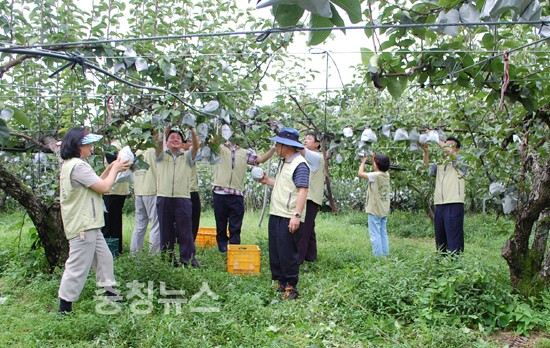 27일 한국농어촌공사 충남지역본부,기술본부,논산지사 직원 50여명은 논산시 광석면 청동리 이일순씨 농가에 대한 배 수확 및 운반,지지대 보수등 과수농가 지원에 나섰다.