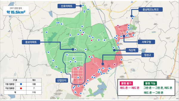 이번에 확대된 구간은 충남테크노파크, 상덕리, 마정리, 양당리 등 7.5㎢, 정류장 26개소로 총 15.5㎢, 115개소 정류장에서 콜버스 이용이 가능하다.