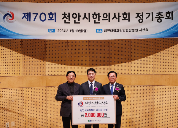 [충청뉴스 박동혁 기자] 천안시복지재단(이사장 이운형)은 23일 천안시한의사회(회장 서정욱)가 취약계층 지원을 위해 후원금 200만 원을 전달했다고 밝혔다.