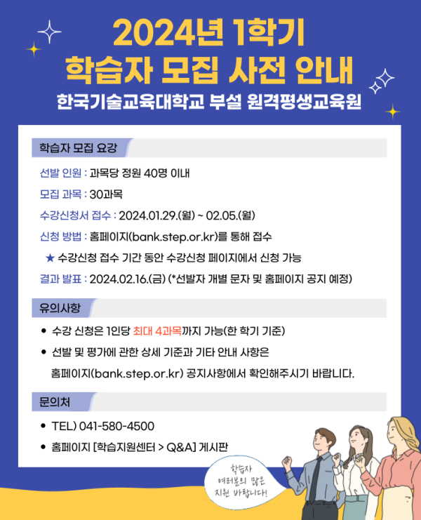 [충청뉴스 박동혁 기자] 한국기술교육대학교 부설 원격평생교육원이 ‘2024년도 1학기 학점은행제’ 학습자를 모집한다.