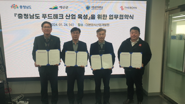 도는 24일 예산군 더본외식산업개발원에서 유재룡 산업경제실장과 도중선 예산군 부군수, 박윤제 공주대 식품공학과 교수, 변준호 ㈜더본코리아 본부장 등 10명이 참석한 가운데, ‘푸드테크 산업육성 및 푸드테크 연구지원센터 유치’를 위한 다자간 업무협약을 체결했다고 밝혔다.