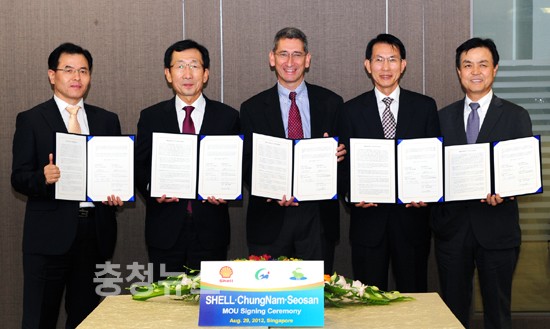 도는 29일 싱가포르 Shell사에서 권희태 충남부지사와 마크 게인스보로우(Mark Gainsborough) Shell 대표, 이완섭 서산시장, 문종박 현대오일뱅크 전무, 강달호 현대쉘베이스오일 사장 등이 참석한 가운데 투자협약을 맺었다.