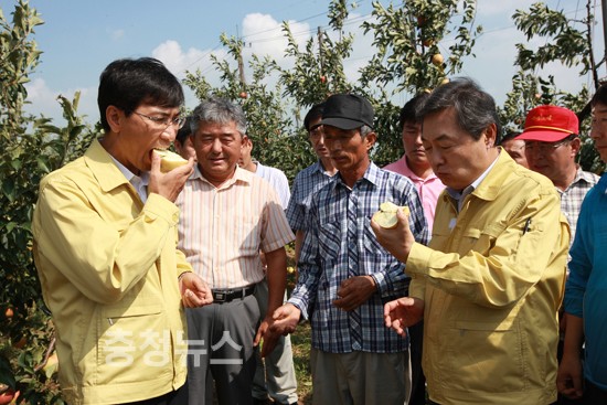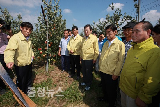 ▲ 29일 오후 안희정지사와 맹형규행정안전부 장관이 태풍피해 당진 순성면 과수 농장 현장 방문했다.