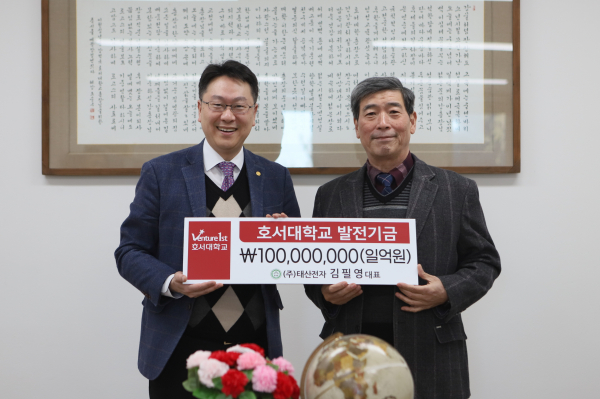 [충청뉴스 박동혁 기자] 호서대학교는 김필영 ㈜태산전자 대표로부터 발전 기금 1억 원을 전달받았다고 26일 밝혔다.