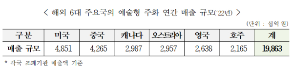 해외의 경우 미국, 캐나다, 오스트리아, 호주 등 많은 국가에서 예술형 주화 시장이 활성화 돼 있다. 2022년 기준 글로벌 최대 발행국 미국은 연간 4.8조원의 매출규모를 기록하고 있으며, 최저 수준인 호주도 2.1조원에 이르는 등 주요 6개국의 예술형 주화 시장 규모는 20조원 수준에 달한다고 밝혔다.