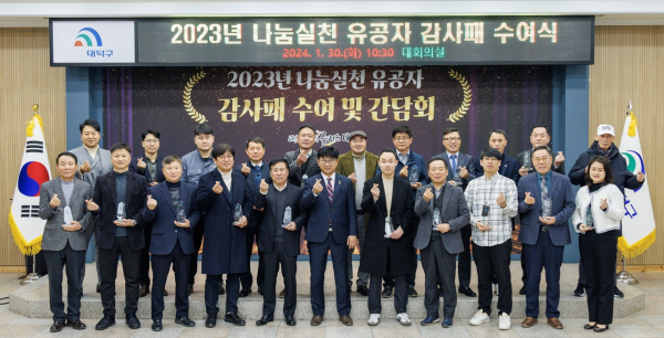 [충청뉴스 박영환 기자] 대전 대덕구(구청장 최충규)는 30일 구청 대회의실에서 지역의 어려운 이웃들을 위해 지속적인 나눔을 실천해 온 후원자를 초청해 감사패를 수여했다고 밝혔다.