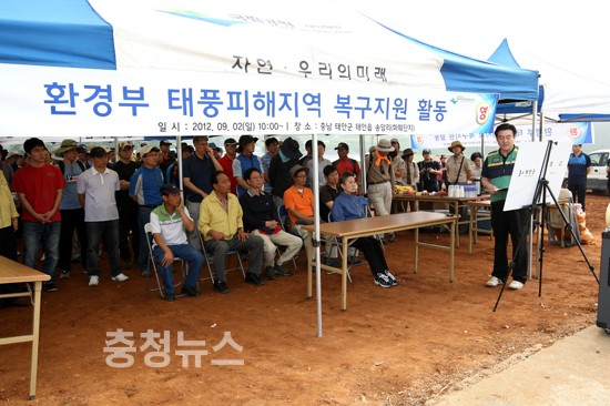 환경부(장관 유영숙)는 9월 2일(일) 오전부터 태풍 볼라벤과 덴빈의 영향으로 피해가 심각한 충남 태안군 태안읍 송암리 화훼단지에서 비닐하우스 피해복구사업을 지원한다.