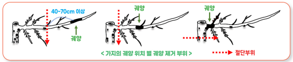 이때 작업 도구는 70% 알코올에 90초 이상 담가 소독하고 절단한 가지는 과원에서 멀리 떨어진 곳에 모아두거나 땅에 묻는다.
