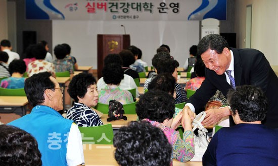 ▲ 박용갑 중구청장은 실버건강대학 개강식에 참석해 인사를 하고 있다.
