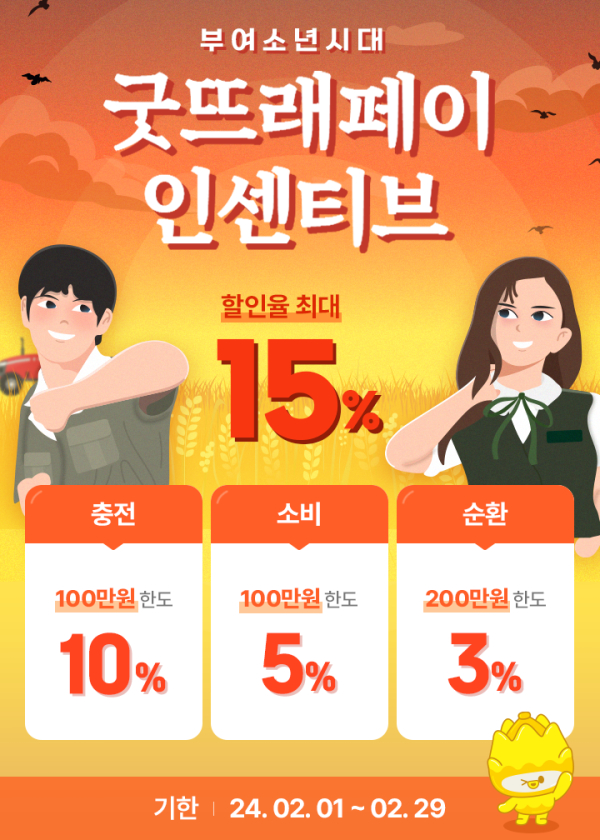[충청뉴스 부여 = 조홍기 기자] 부여군(군수 박정현)은 설을 맞아 전국 유일의 공동체 순환 지역화폐인 굿뜨래페이의 인센티브에 대해 2월 한 달 동안 기존 10% 에서 5% 인상한 15% 인센티브 정책을 시행한다.
