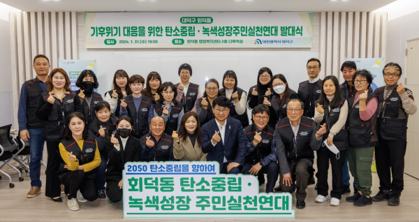 [충청뉴스 박영환 기자] 대전 대덕구(구청장 최충규)는 1월 31일 회덕동 행정복지센터에서 ‘회덕동 기후 위기 대응을 위한 탄소중립·녹색성장 주민실천연대’(이하 탄소중립주민실천연대)의 발대식을 개최했다고 밝혔다.