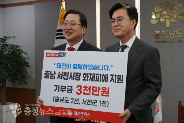 [충청뉴스 권상재 기자] 충남도는 1일 도청 접견실에서 대전시로부터 3000만 원의 서천특화시장 대형화재 피해 복구 지원을 위한 성금을 전달받았다.