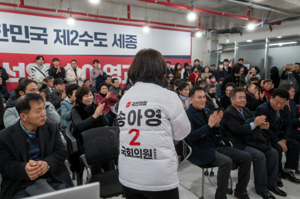 이날 개소식에는 김충식, 윤지성 지역구 세종시의원을 비롯한 사무실과 복도를 가득 채운 시민 500여명의 지지자들은 ‘송아영’을 연호하며 지지세를 드러냈다.