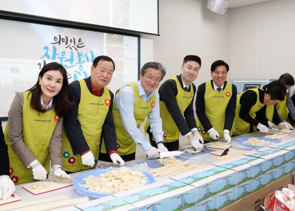 이날 봉사자들은 정성스럽게 썰은 떡국떡과 직접 제작한 방한용품(팥손난로, 넥워머)을 어려운 이웃 450가구에 전달했다.