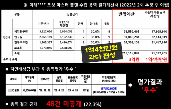 또한 “용역비를 3배 이상 과 편성하거나, 업체의 과실로 지연배상금을 징수한 용역에 대해 ‘우수’로 평가함으로써 평가 자체에 대한 신뢰도 떨어졌다”라고 말했다.