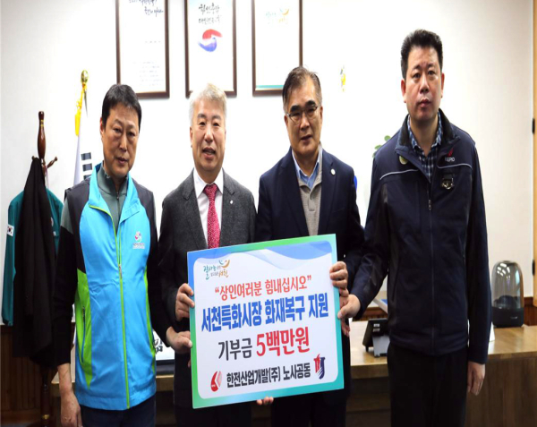 [충청뉴스 서천 = 조홍기 기자] 한전산업개발(사장 함흥규)와 한전산업개발노동조합(위원장 송홍곤)이 지난달 발생한 서천특화시장 화재와 관련 피해 상인들의 일상회복을 위한 성금을 기탁했다.