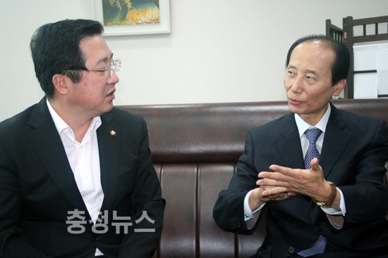 ▲김신호 교육감은 7일오후 이장우 의원을 예방하고 동구지역 교육발전방향을 전달하고 협조를 당부하고 있다
